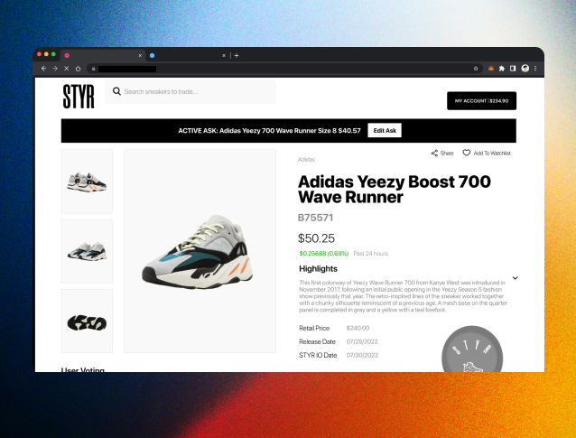 Product pages were designed to give users all the information needed to trade or purchase sneakers confidently. Key details include the sneaker’s ‘market’ value, current buy/sell activity, and past transactions. The STYR coin serves as the primary currency, providing purchasing power within the blockchain-based marketplace.