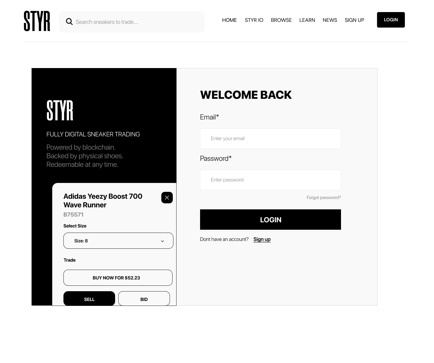 STYR’s landing page was designed to immediately showcase the platform’s value and make navigation intuitive. The layout highlights key features, featured sneakers, and user benefits, while clean visuals and strategic calls-to-action guide visitors toward signing up or exploring the marketplace. The design balances aesthetic appeal with clarity, creating an engaging first impression for new users.